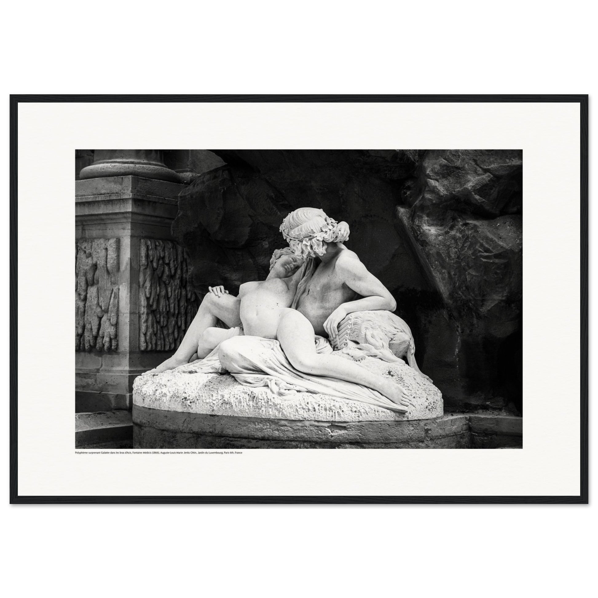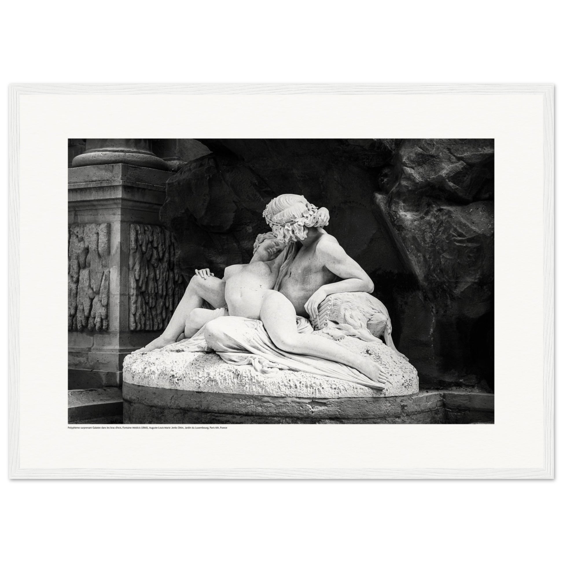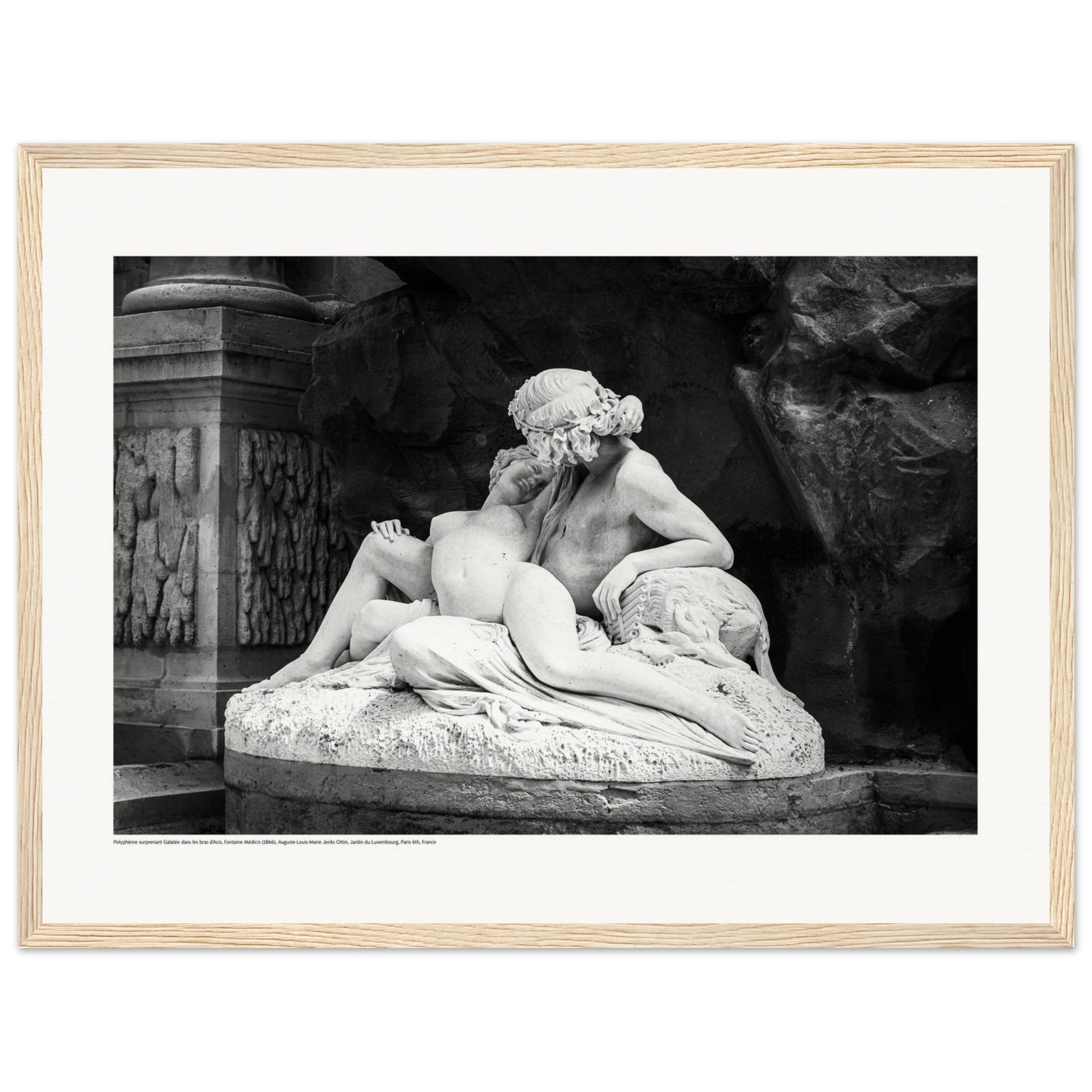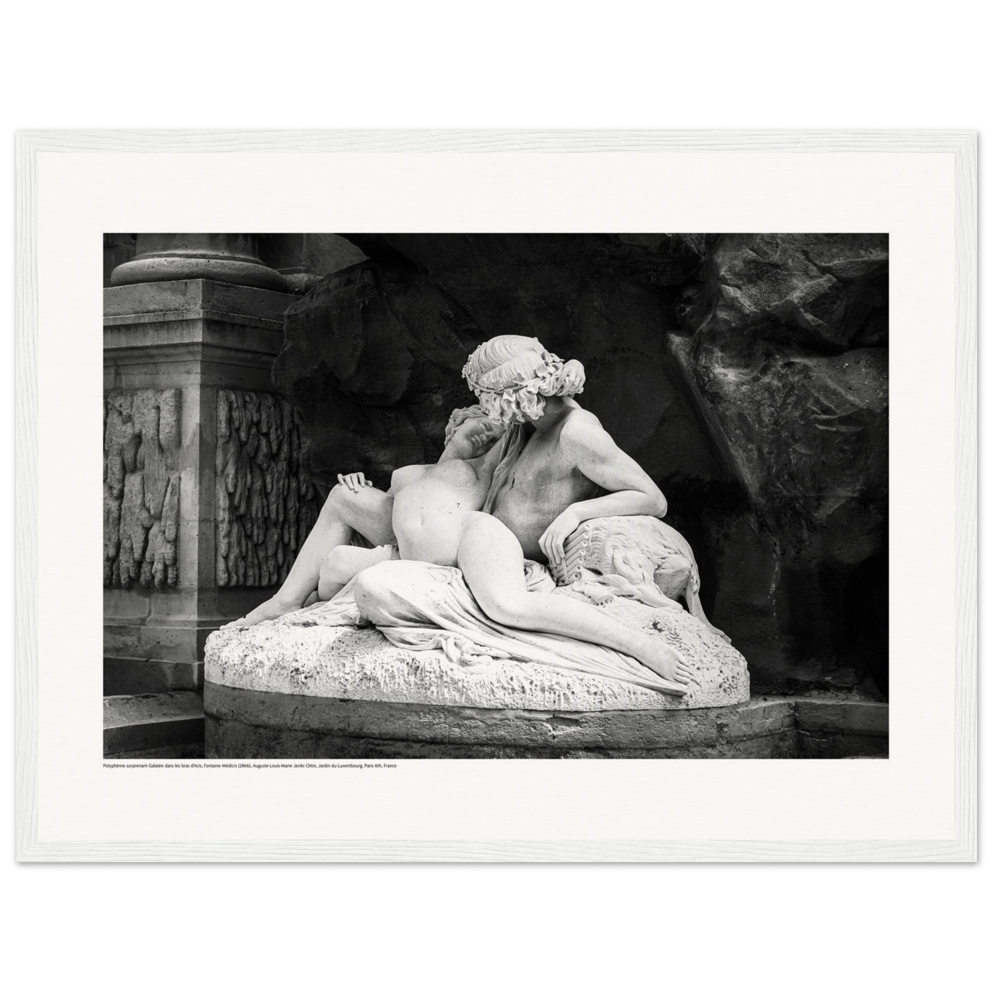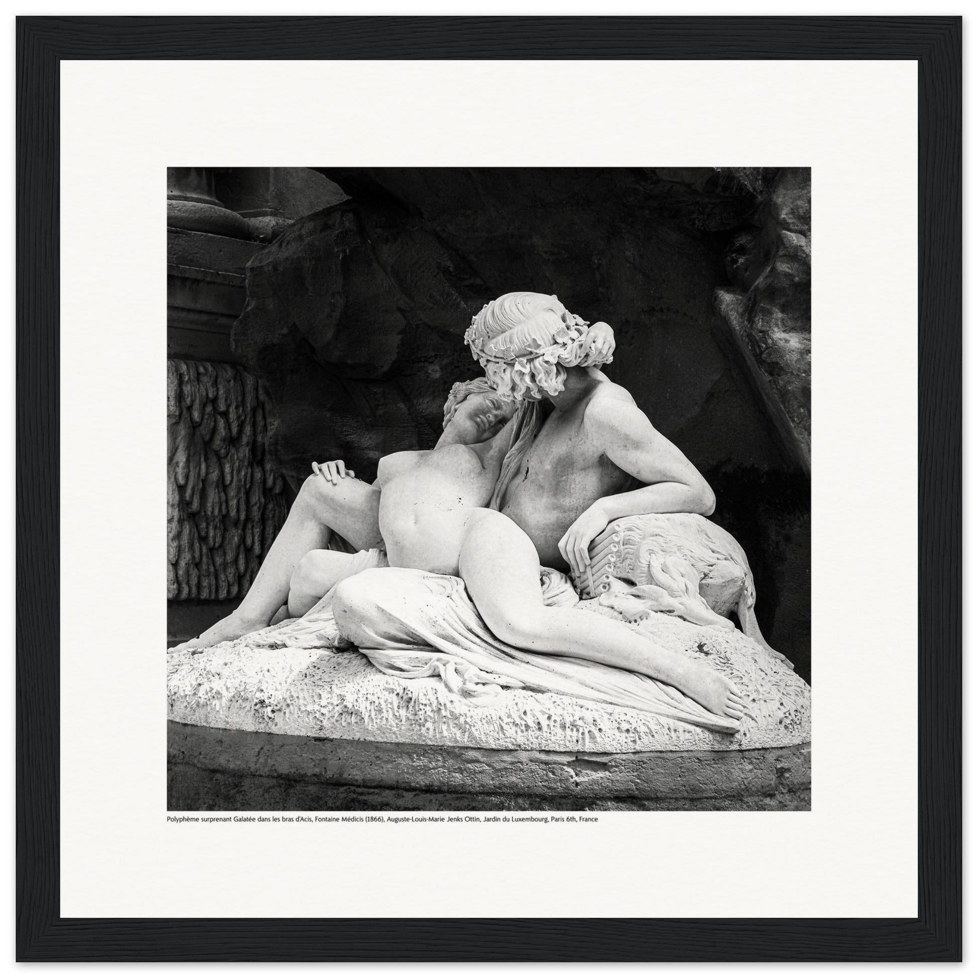 "Polyphème surprenant Galatée dans les bras d'Acis" is also known as the Fontaine Medicis. It was originally designed back in the 1600s when Marie de Medici, who was the Queen regent for her son King Louis XIII after her husband died, decided to have a palace built and gardens laid out in a style reminiscent of her days in Italy. The Cyclops Polyphemus is in love with Galatea, a nereid, nymph of thesea. She prefers the Sicilians Acis. Polyphemus surprises them to get her and kills his rival by crushing him under a rock. Galatea then changes the blood of Acis into a river bearing his name in Sicily.